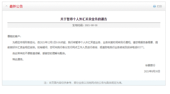 8月31日消息,华夏银行发布公告,为顺应市场形势变化,自2021年12月1日0:00点起,我行将暂停个人外汇买卖业务,业务恢复时间将另行通知。请您根据自身需要,提前做好外汇资金相应安排。如有疑问,您可向我行各分支行网点工作人员进行咨询,或请致电我行业务咨询及投诉电话95577。 由此带来的不便敬请谅解,感谢您的理解与配合。 特此通告。 华夏银行 2021年8月30日