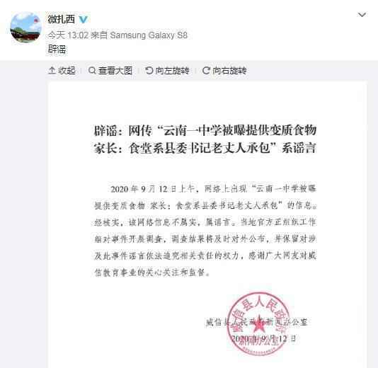 千龙网讯 云南省昭通市威信县委宣传部官方微博9月12日发布辟谣消息称,2020年9月12日上午,网络上出现的“云南一中学被曝提供变质食物 家长:食堂系县委书记老丈人承包”信息。经核实,该网络信息不属实,属谣言。当地官方正组织工作组对事件开展调查,调查结果将及时对外公布,并保留对涉及此事件谣言依法追究相关责任的权力,感谢广大网友对威信教育事业的关心关注和监督。