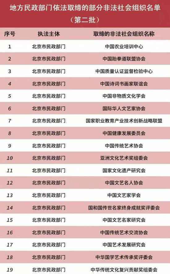 原标题:中国农业培训中心、国家文化遗产研究会……这些都是假的! 82家!民政部民政部打击整治非法社会组织工作领导小组办公室今天向社会公布第二批地方民政部门近年来依法取缔的部分非法社会组织名单。其中不乏大量冠以“国”字头的非法社会组织。社会公众如果发现名单中的非法社会组织仍在开展活动的,可依法向公安机关报案。同时,提醒有关机构和社会公众,在与社会组织开展合作或参与其活动时,请通过“中国社会组织政务服务平台”()、“中国社会组织动态”政务微信(微信号:chinanpogov)核实其身份,避免上当受骗;也欢迎社会各界通过“中国社会组织政务服务平台”提供涉嫌非法社会组织活动线索。(李昌禹)