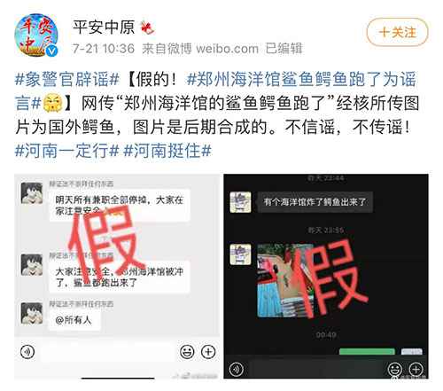 7月20日,社交媒体上流传一则“郑州市海洋馆被冲了,鲨鱼都跑出来了”“有个海洋馆炸了鳄鱼出来了”的消息,还配上了疑似鳄鱼的图片,引起了不少网民的恐慌。