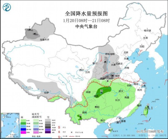 1月20日08时至21日08时,新疆北部、西藏东部和南部、内蒙古西部、甘肃东部、宁夏东部、陕西、山西、河南大部、湖北西北部等地部分地区有小到中雪或雨夹雪,其中,新疆沿天山地区和伊犁河谷、陕西北部和南部、河南西部等地部分地区有大雪(5~9毫米)。江汉、江淮西部、江南大部、西南地区大部、广西大部、广东北部、台湾岛等地部分地区有小到中雨,其中,重庆中部、台湾岛北部等地部分地区有大雨(25~35毫米)。西北地区东部、辽东半岛、江南东部等地部分地区有4~5级风。