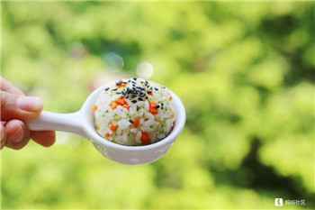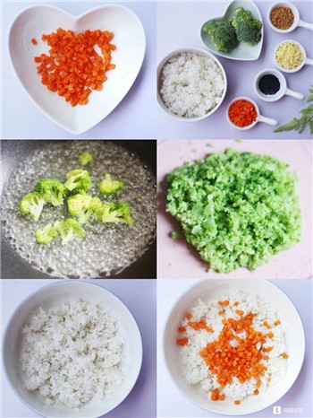 米饭一碗,胡萝卜半根,肉松1大勺,西兰花100g,马苏里拉芝士碎适量,盐少许。