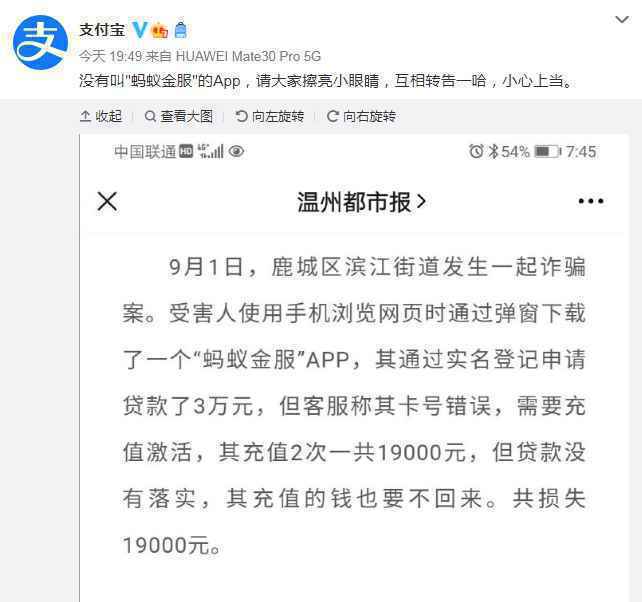 支付宝官方微博发布图片显示,9月1日,鹿城区滨江街道发生一起诈骗案。受害人使用手机浏览网页时通过弹窗下载了一个“蚂蚁金服”APP,其通过实名登记申请贷款了3万元,但客服称其卡号错误,需要充值激活,其充值2次一共19000元,但贷款没有落实,其充值的钱也要不回来。共损失19000元。